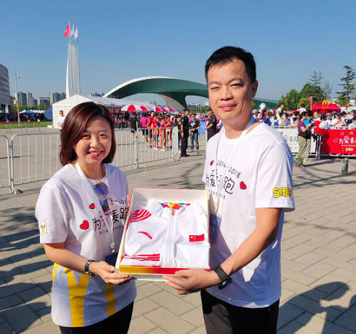 安踏儿童总裁林翔华先生赠予麦当劳中国首席执行官张家茵女士“亚运会中国队领奖服”