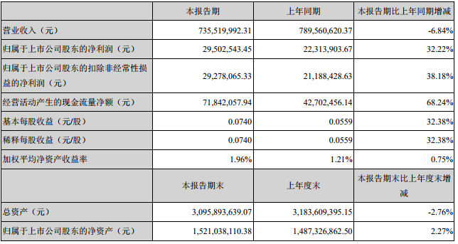 根据公告,上半年实现营业收入7.36亿元,同比下降从6.84%;归属于上市公司股东的净利润为0.30亿元,同比上升32.22%。