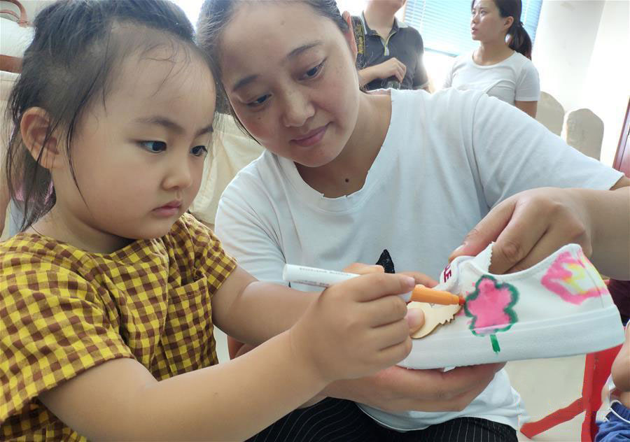 8月31日,在安徽省合肥市包河区方兴社区,孩子在家长的带领下给小白鞋涂鸦。