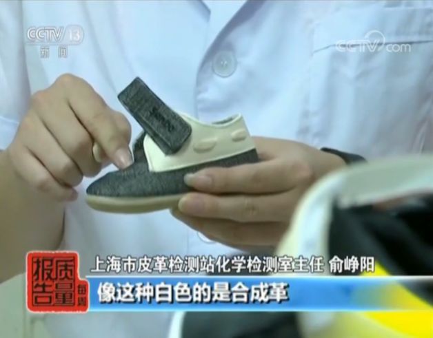 上海市皮革检测站化学检测室主任 俞峥阳:它是合成的,上面是合成革。就是下面一层布屐,上面一层其实就是合成材料,也是塑料的一种。