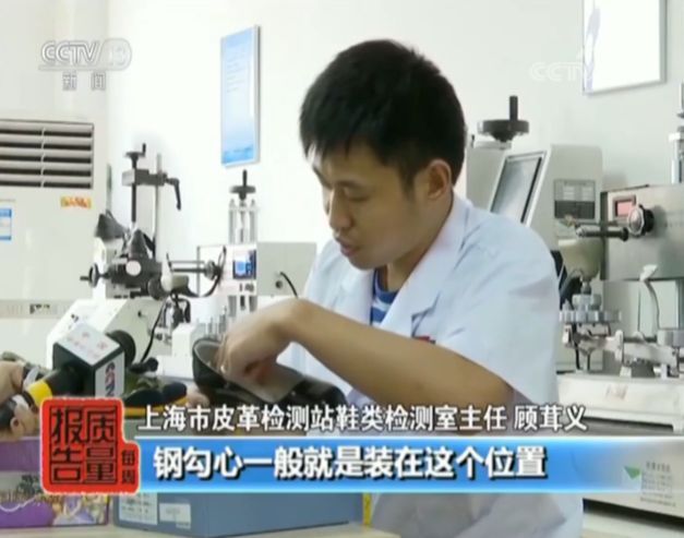 上海市皮革检测站鞋类检测室主任 顾茸义:钢勾心一般就是装在这个位置,这个就是这双鞋子里边拆出来的勾心样品。这次它的不合格的项目为,长度下限值。我们可以来测量一下。它的长度下限值,是由鞋子的大小和跟高来决定的,这双鞋是230毫米的大小,有效跟高小于30毫米,所以它的长度下限值的要求是100毫米。这根钢勾心我们测下来是80毫米。