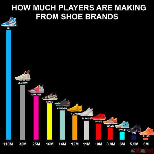 【-数据统计】NBAonCourt 今天更新 IG,晒出了一张每年球星签名鞋利润榜单。