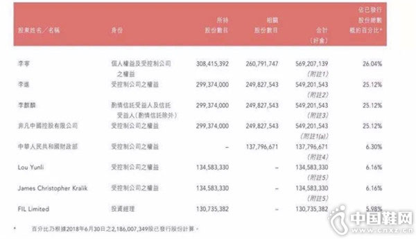 李宁2018半年报中披露,在报告期截止日拥有5%以上公司权益的股东分别有李宁本人、李麒麟(李宁侄子)、李进(李宁胞兄)、非凡中国、中华人民共和国财政部、楼云立、James Christopher Kralik、FIL Limited。