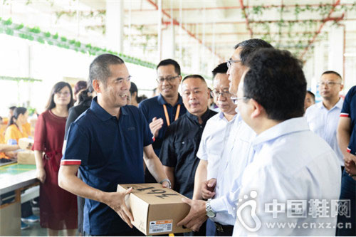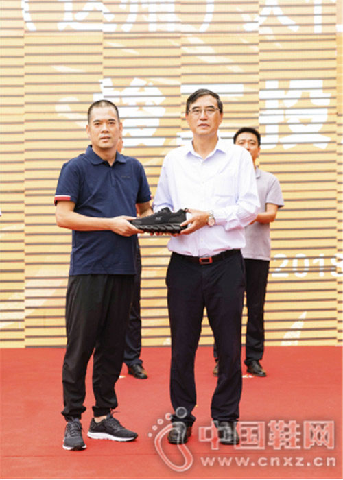 361°集团执行董事兼总裁丁伍号(一排左一)向达州市委副书记、市长郭亨孝(一排左二)赠送361°(达州)大竹鞋服产业园生产线下线第一双鞋