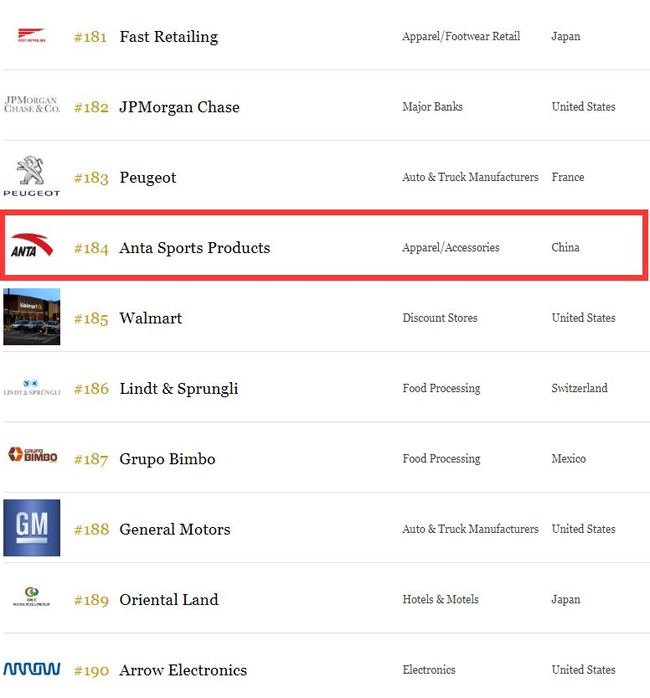 该榜单中,共有19家中国企业上榜。除安踏体育用品公司外,还包括阿里巴巴集团、华夏银行、贵州茅台集团、伊利集团、格力电器、青岛海尔等,皆具有全球知名度