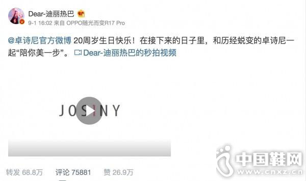 2016年时尚女鞋皮具品牌卓诗尼JOSINY具有战略意义的签约迪丽热巴为品牌代言人。2018,正值卓诗尼JOSINY的20周年华诞,一系列的活动拉开了时尚升级的华丽序幕。
