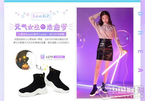 而第二套穿搭则是圆梦大使董馨为元气少女准备的~以短筒袜靴为重点,通过一些小心机的设计让女孩无形中拥有高挑的大长腿,解救粗腿女孩于水火之中,5.5cm的厚底不仅穿着舒适而且还特别显高;袜靴紧贴脚踝的设计能更显脚踝纤细,比宽口短靴的瘦脚踝程度更甚,难怪连明星都纷纷为这款袜靴打CALL;靴后跟和袜口处的白熊与细碎星光,增添了元气少女的追梦元气。