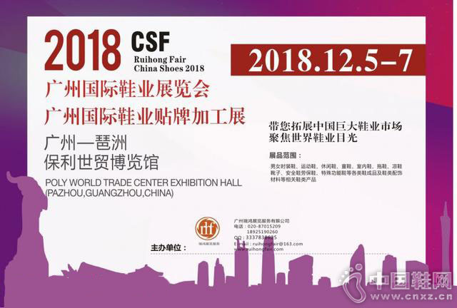 CSF China Shoes Fair广州国际鞋业展览会是由广州瑞鸿展览服务有限公司联合打造的制鞋行业专业成品鞋业展览会。2018年展览将于12月5日-7日在广州-琶洲-保利世贸博览馆再度举行。