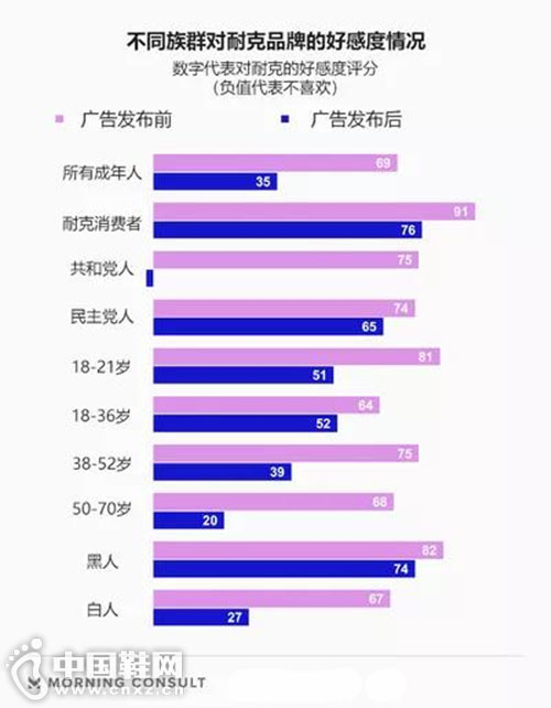 事实上,根据美国咨询公司Morning Consult在9月7日发布的研究报告显示,在耐克发布那则广告之后,美国社会中几乎所有群体对耐克的好感度都有所降低,包括耐克的核心消费群体。