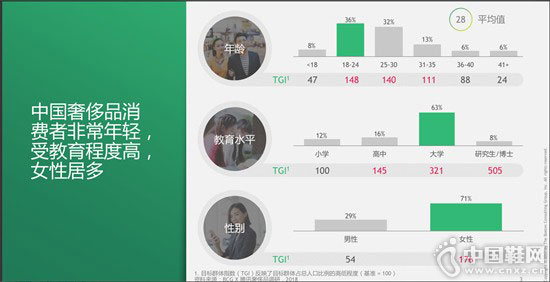 【-行业动态】受消费降级影响不大的中国奢侈品市场,未来还将在全球奢侈品市场占有更重的份量。根据BCG的数据,未来中国消费者占全球奢侈品市场的比例将从2017年的32%增至2024年的40%,带动全球奢侈品市场75%的增长。尽管千禧一代在全世界范围内都逐渐成为奢侈品消费的主流人群,中国奢侈品消费人群里的千禧一代平均又比全世界千禧一代年轻很多。