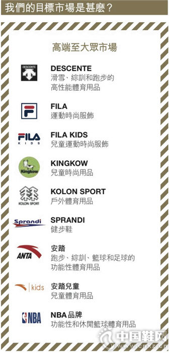 在多品牌战略下,安踏目前在中国拥有经营权的国际品牌有FILA、韩国户外品牌Kolon、登山运动品牌Sprandi、冬季运动品牌Descente和童装品牌Kingkow等。包括安踏主品牌在内,集团已经大面积覆盖各类体育用品细分市场。