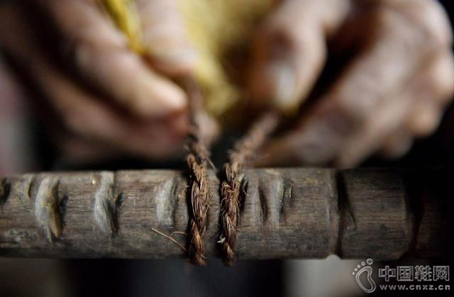 湖北省宣恩县珠山镇大坝沟村77岁的农民张南庭在搓棕丝绳。