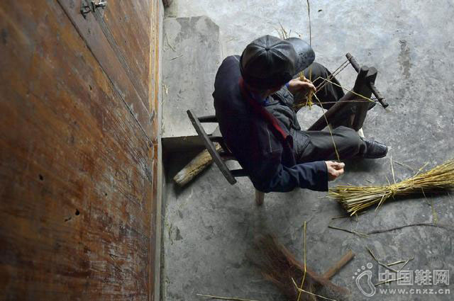 湖北省宣恩县珠山镇大坝沟村77岁的农民张南庭在“草鞋马”上编织草鞋。