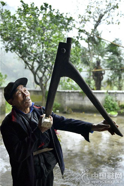 湖北省宣恩县珠山镇大坝沟村77岁的农民张南庭在准备打草鞋的“草鞋马”。