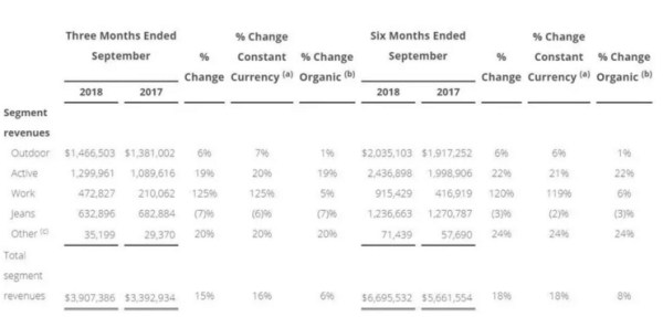 按部门分,包括Vans、Timberland、Wrangler和The North Face等品牌的户外运动部门第二财季销售额同比增长7%至14.66亿美元; 包括Lees在内的牛仔部门销售额下跌6%至6.32亿美元; 包括Red Kap、Bulwark和Majestic等品牌的制服部门销售额同比增长125%至4.72亿美元; 其他部门销售额则同比大涨20%至3520万美元。