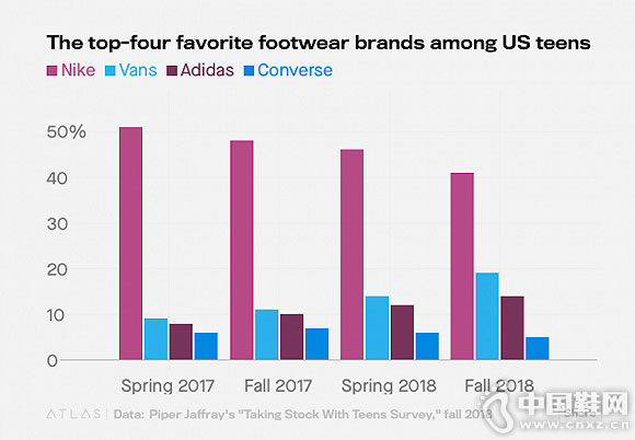 今年,Piper Jaffray的调查对象包括6200名家庭年平均收入为5.58万美元的青少年,以及2400名家庭年平均收入为10.19万美元(中高收入)的青少年,共8600人,平均年龄为16岁。其中,41%的受访者还是将视为自己最喜欢的运动鞋品牌。滑板运动品牌Vans和德国运动品牌阿迪达斯分列二、三位。不过,耐克的市场份额正在被Vans和分食。有19%的受访者表示Vans是其最爱的鞋类品牌,这是Vans和耐克距离最小的一次。