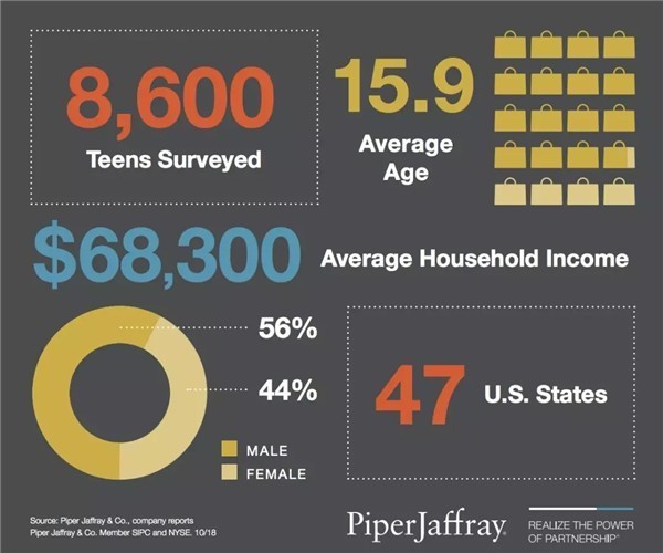 日前,美国投行及资产管理公司 Piper Jaffray 公布了2018年秋季版(第36版)美国青少年消费研究报告(Taking Stock With Teens)。Taking Stock With Teens 是 Piper Jaffray 自2001年以来每半年就会进行一次的调查研究项目,本次报告汇集了全美47个州8600名青少年消费者的购物习惯和品牌偏好信息。这些青少年平均年龄为16岁,平均家庭年收入为6.83万美元,男女比例56:44。