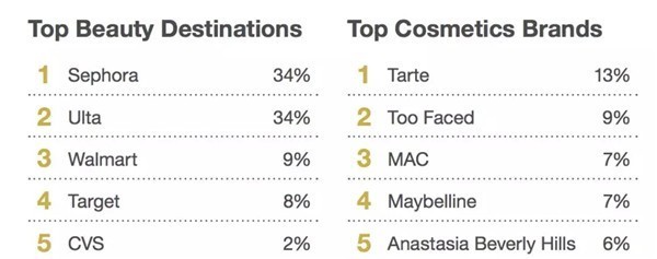 就美妆品牌而言,Tarte 品牌在所有受访者中最受欢迎,占有率为13%,其次是 Too Faced(9%),MAC 和 Maybelline(美宝莲)则以同样7%的占有率并列第三。