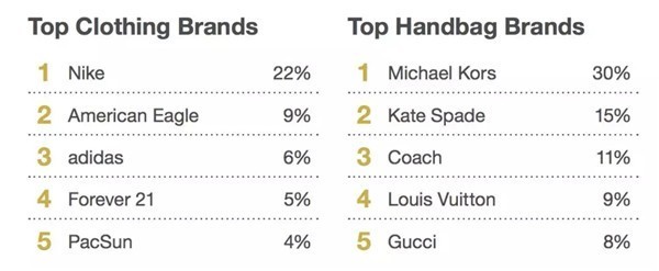 手袋品类中最受欢迎的品牌为 Michael Kors ,占有率高达30%,Kate Spade 和 分别以15%和11%的占有率位居第2和第3 位。
