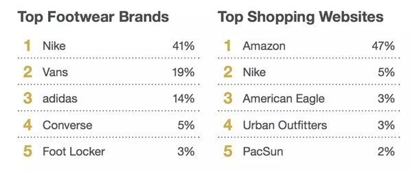 在购物网站选择上,Amazon 以47%的占有率位列第一,比例远高于位居第二和和第三的 Nike(5%)和 American Eagle(3%)。