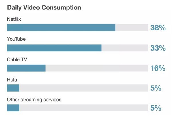 在视频消费选择上,Netflix 依然以38%的占有率位居榜首,YouTube 和有线电视分别以33% 和16% 的占有率位居第二和第三。