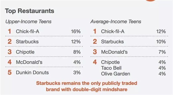 Chick-fil-A 成为青少年的首选餐厅,星巴克为第二选择。在高家庭收入的青少年中,Chick-fil-A 和星巴克的占有率分别为16%和12%;而在平均水平家庭收入的青少年中,这两家餐厅品牌对应的比例分别为12%和10%。
