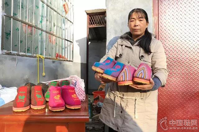 郭坡村党支部书记王同华介绍,庞国新患有肾结石,手术后不能干重活,家里还有一位老人和两个孩子。2017年,市乡村扶贫干部根据她会编织的实际情况,积极引导她发挥强项,在种地之余,学习织鞋技术,由于她的悟性高,鞋的款式不断翻新。