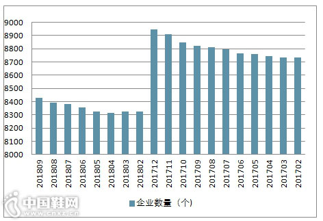 2017-2018年中国皮革、毛皮、羽毛及其制品和制鞋业企业数量走势