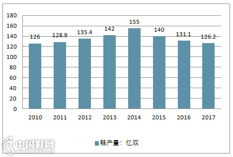近两年来,虽然我国鞋业产量占世界鞋业产量比重有所下滑,不过我国依旧是世界上最大的鞋类生产国。2016年,我国鞋产量达到131.1亿双,占世界比重达到57.0%, 2017年我国鞋产量为126.2亿双。