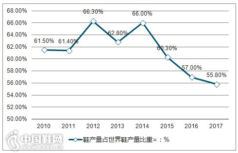 2010-2017年我国鞋产量占世界鞋产量比重情况走势
