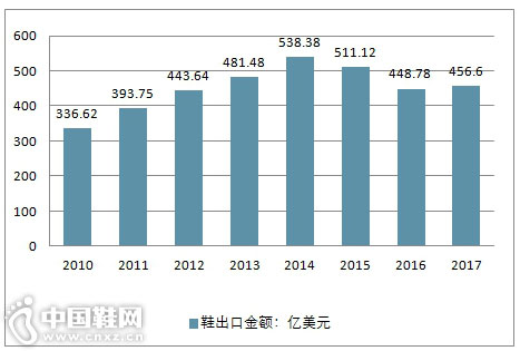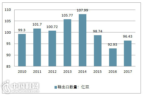 2017年我国鞋出口扭转颓势,出口数量和金额双增长,全年出口鞋子数量达到96.43亿双,较上年增长3.77%;出口鞋子金额达到456.60亿元,同比增长1.74%。