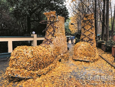 “足迹”是一双大头靴子,大概有3.7米高,用黄色的银杏叶做成鞋面,红色的枫叶缠成了鞋带。