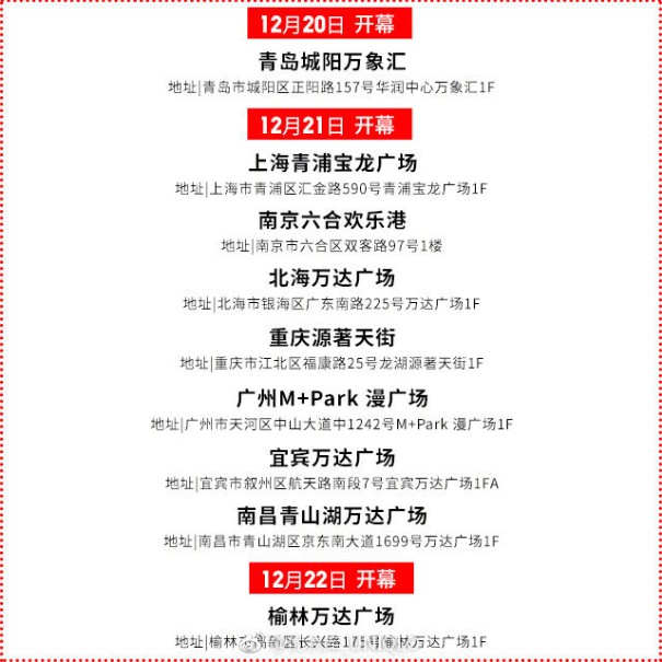 于12月21日,优衣库有6家新门店同日开业,包括:上海青浦宝龙广场店、南京六合欢乐港店、北海万达广场店、重庆源著天街店、广州M+Park漫广场店、宜宾万达广场店、南昌青山湖万达广场店。