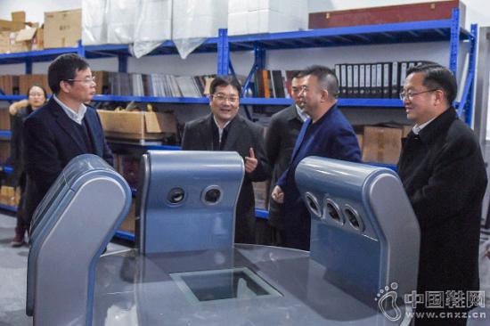 方书记在王振滔董事长带领下参观第一代脚型测量仪。