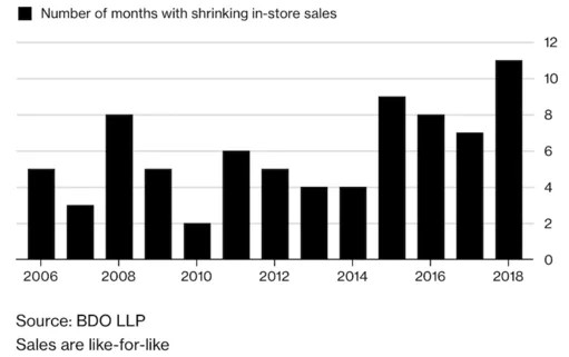 上图:2006-2018年英国历年实体零售店销售额下降月份数,其中2018年有11个月实体零售店销售额下降,为12年来最高