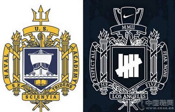 美国海军学院校徽(左)与耐克新商标(右)