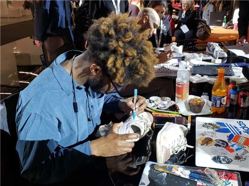 现场我们还有幸体验了 Sneakers&chill团队的艺术家们免费提供的运动鞋手绘服务。据介绍,Sneakers&chill团队共有30多位艺术家,包括:纹身师、平面设计师等等,平时一双运动鞋的手绘价格大致在100欧元,包括adidas、、converse等众多品牌都曾与Sneakers&chill团队合作为用户带来运动鞋手绘定制体验。