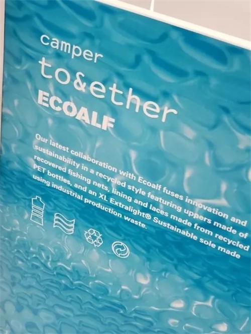 在西班牙知名鞋履品牌 Camper的展台,我们看到品牌专门设置了一块区域,展出了与美国的时尚环保Ecoalf的联名合作产品,由PET塑料瓶制成鞋面,工业废料制成XL Extralignt®环保鞋底。