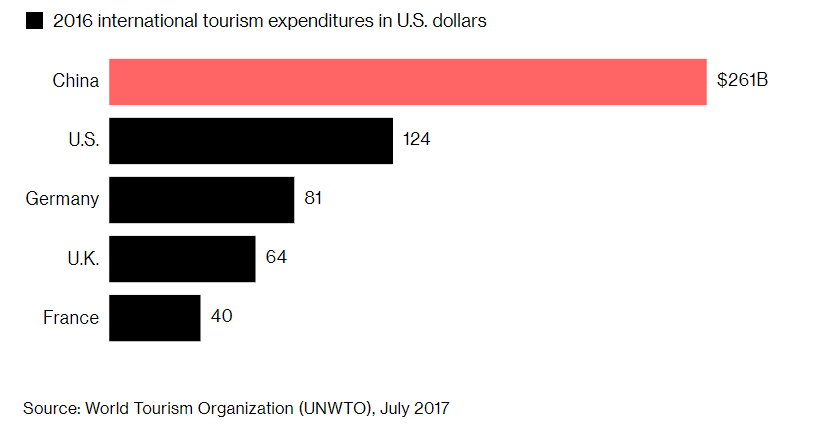 中国游客对于奢侈品行业来说是绝佳的目标客户,中国市场快速的经济发展,让游客们拥有大量的财富。此外中国游客的消费热潮开始于 2008年金融危机过后,全球市场整体低迷的时期,因此中国消费者很快成为了全球奢侈品市场的支柱。根据联合国机构World Tourism Organization 的统计,在2012年中国游客便成为了全球旅游消费金额最高的群体,2016年达到了2610亿美元。