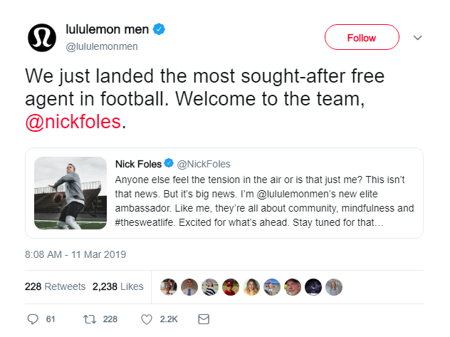Foles)在其个人推特上宣布,自己与运动服饰品牌Lululemon签下一份代言合同。