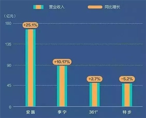 2017年四大运动品牌,还在第三位,与第四位差距并不大,今年则被大步超越,而且营收被第三名拉开了高达12亿人民币。笔者认为361度是拥有强大的“锚定效应”优势,然而这个效应却没有起到任何作用。