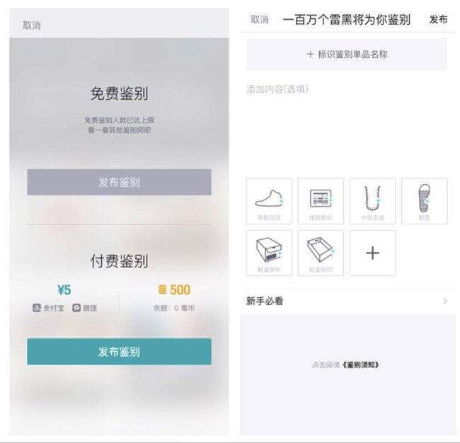 具体来说,“毒”的核心业务——作为一个球鞋鉴定&转卖平台,其流程是:买家下单—卖家寄货给平台—平台鉴定&质检—发货给买家—买家确认收货。“毒”在其中的角色时中间鉴定方和平台方,靠佣金盈利:抽取卖方成交价的7.5%~9.5%,以及收取买家的鉴定费(5元/件)。用户也可以通过上传照片,选择鉴定师来帮助自己鉴定球鞋。费用为5元一次。除此之外,“毒”还具备社区功能。