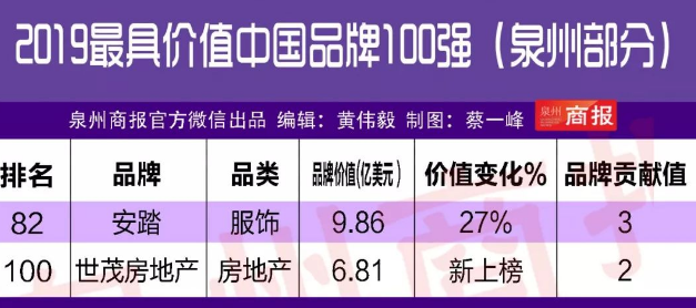 5月6日,全球知名传播服务集团WPP与调研机构凯度华通明略共同发布了“BrandZ2019最具价值中国品牌100强”。泉州有2个品牌上榜:以9.86亿美元的品牌价值,居第82位;世茂房地产以6.81亿美元的品牌价值,居第100位。