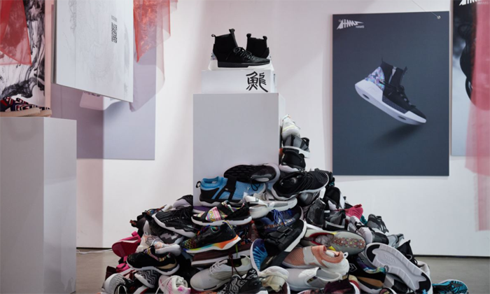 门店的装潢也以相同的主题呈现:鱼跃龙门、向死而生,用回收旧鞋的形式来提高人们的环保意识。同时在现场,HAMS 两位主理人 Eric 和 Han 还邀请了艺术家