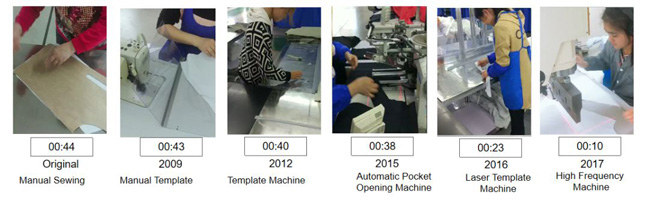 传统手工开口袋需要44秒,到自动化开口袋只要10 秒,得到了一个很好的效率提升。 相信在不久的未来,自动化和智能化的生产模式将会完全替代,并且完全颠覆传统的生产模式。 员工不再是一个体力劳动者,更多是一个脑力劳动者。