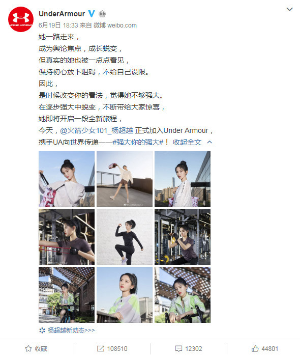 在当前选秀盛行的年代,越来越多的明星通过选秀节目一夜爆红,但由于选秀相似度太高,为了迎合市场需求,慢慢地失去了选手本身的特点,大多数选秀明星面对的是爆红之后的快速落寞。而杨超越可以说是这两年一个特殊的存在,她通过2018年选秀节目《创造101》出道,是组合中人气和话题最高的艺人之一,有着“锦鲤”之称。安德玛官方微博发出短短两个小时,转发过10万,评论超8000条,点赞3.9万次,可以看得出全民“锦鲤”的号召力。