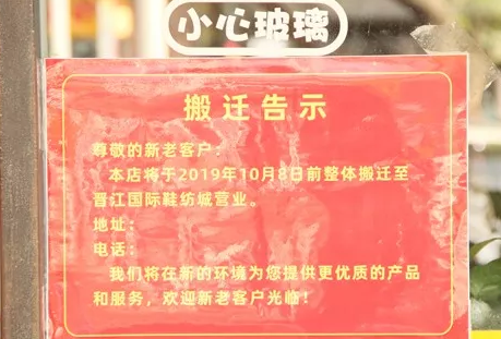 07月31日讯,记者走访了晋江鞋都市场(以下简称“旧市场”),发现不少商户都在门口、铺内等显眼位置贴出搬迁公告:本店将于2019年10月8日前整体搬迁至晋江国际鞋纺城营业。