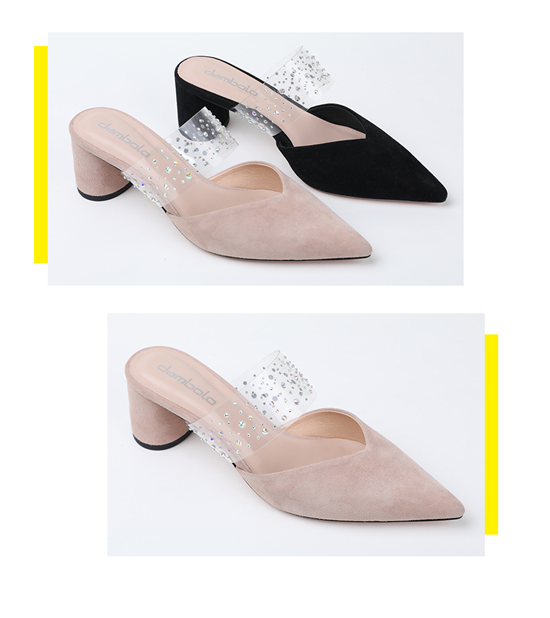 在显高与搭配服饰上,尖头中跟的穆勒鞋更受仙女们喜爱。丹比奴尖头粗跟穆勒鞋,鞋面精选优质羊皮,既耐脏又防水。而为了更好驾驭尖头穆勒鞋增加的脚背带,特采用了今年流行的透明PVC材质,并镶嵌以大小不同的水钻,时尚女人味十足。