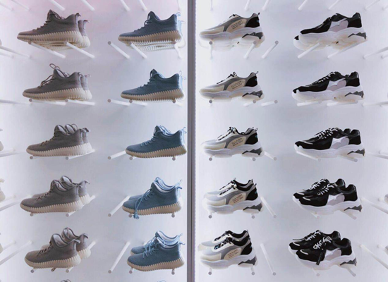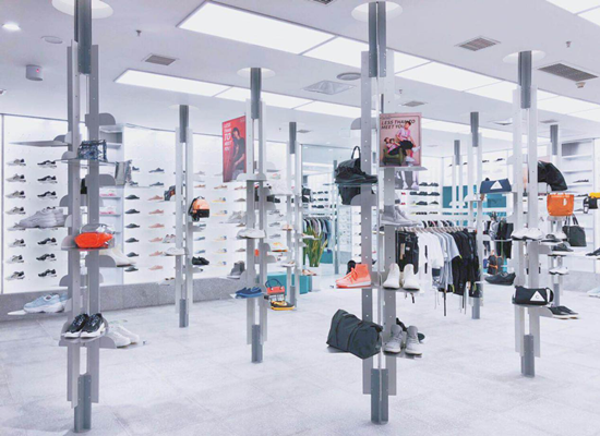 这家概念馆,一进去就给人一种既年轻时尚,又轻松自由的感觉。高级干净的灰白二色构成了LAB店的核心色调,既有大道至简的素朴淡雅之风,也呈现出容纳一切元素的开放自然之态。“丛林”意象和“鞋墙”的设置无疑是LAB店最具创新和巧妙之处。丛林意味着旅程,象征着冒险,是一个宝藏般值得探索与发现的地方,神秘、惊喜、未知、灵感充溢其间。一根根不规则立体状柱子犹如挺拔的森木,其上挂满丰富多彩的产品仿佛鸟巢,张扬出生命力,也不乏科技感。穿行其间,仿佛置身于未来艺术之林,给人耳目一新。