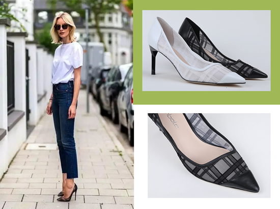 丹比奴格纹网纱尖头高跟鞋,永不过时的黑白双色,舒适的鞋跟高度,无论哪个角度看都完美无死角的设计,优雅满分!搭上紧身牛仔裤简约T恤就很利落帅气,不盛装打扮也没关系,这么一套穿搭出去约会依然气质满格,是七夕最想要展现给他的模样。